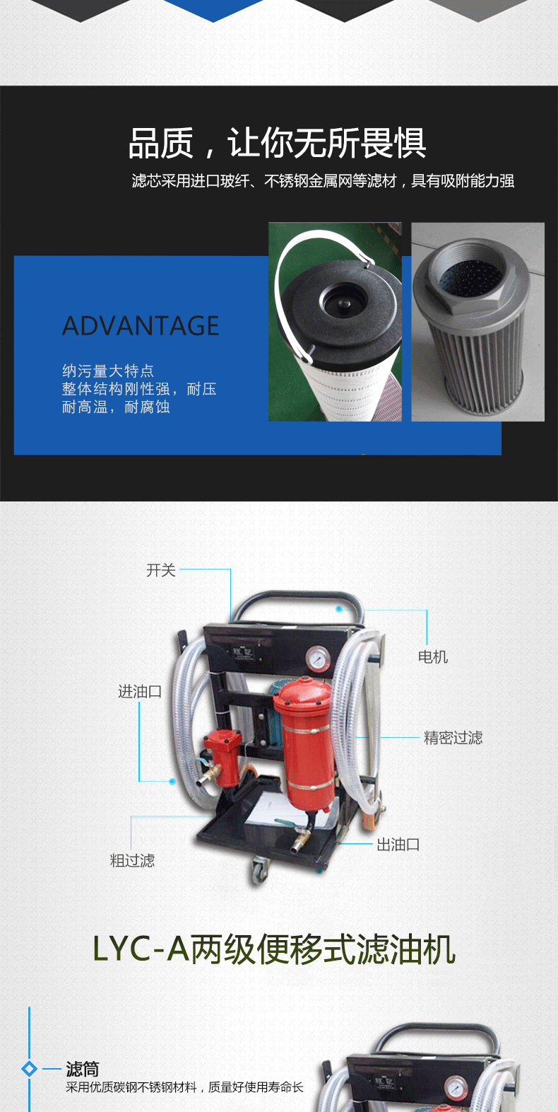 LYC-150A系列移式滤油机用于各行业的液压润滑系统中,滤除油液中的固体颗粒,延长液压元件的使用用于系统加油时的油液过滤,提高系统原油液清洁度;用于旧油回收,降低成本;可独立于主系统,作为旁路过滤装置工作;具有较高的精度和低噪声,使用维护方便,精滤器内滤芯可根据用户选择和要求,在3μm、5μm、10μm、20μm、30μm、40μm中自行选择,只可调换不同过滤精度的滤芯就可达到不同精度的过滤效果。
