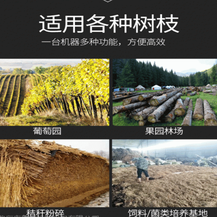 3、适用于果场、林场、茶场、苗圃、园林等修剪残枝,间伐树枝的粉碎;因其作业方便,亦可适用于公园、院校、企事业单位的残枝,树叶、树皮的粉碎;还可适用于食用菌基料粉碎以及赛马场场所铺设物就地粉碎等等。