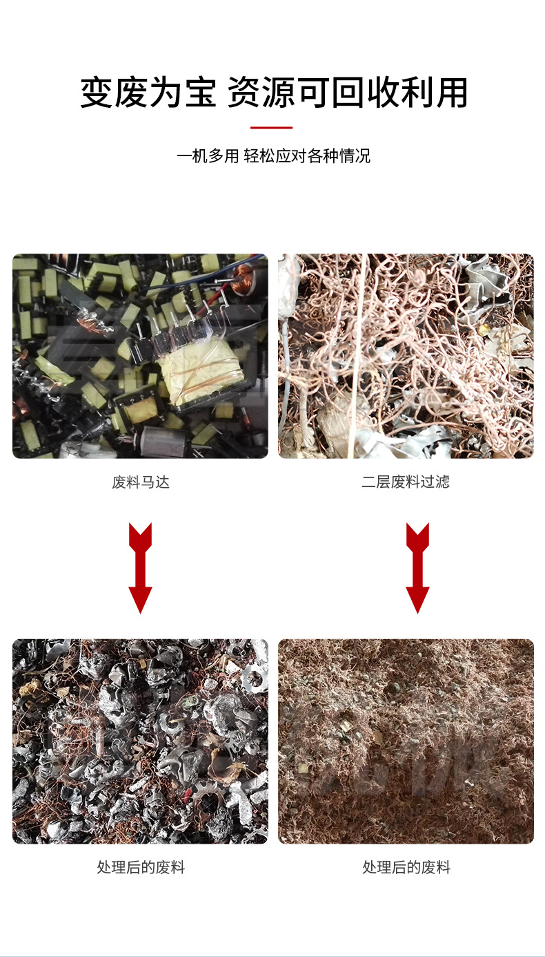 电机转子定子破碎机专门用来破碎小型电机定子、电机转子、小变压器、铜线圈、阀门、水表、黄杂铜、铜铁塑料混合物等。