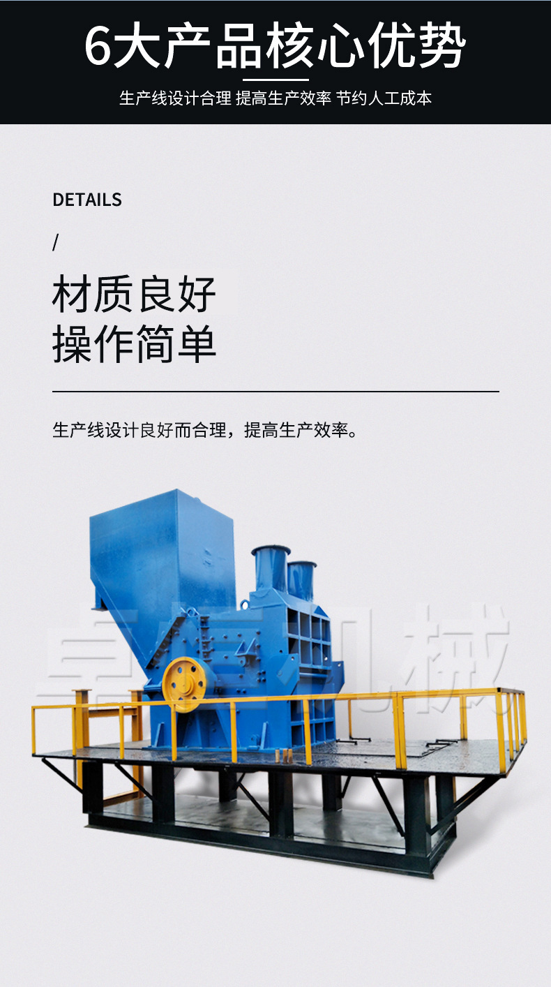该机外观新颖、运行稳定、体积小、维修方便、结构简单、生产能力大。在破碎作业中可将废旧转子、定子、马达表面的铁锈、绝缘漆等表面污物分离;再在磁力分选装置作用下将硅钢片同混杂的有色金属、塑料和橡胶等非铁磁类物料单独归堆,提高产品附加值。
