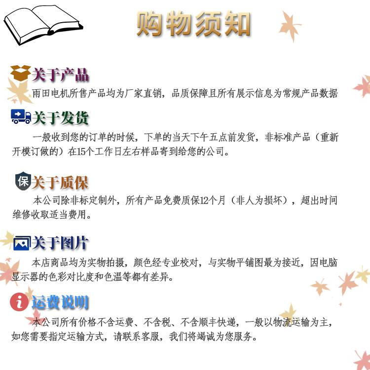 1、非人为情况下雨田(YUTIAN)电机承诺7天包退,15天包换,亲"您"可以放心选购。