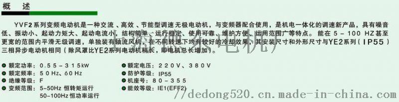 德东电机厂电机设计YVF2112M-4 4KW使用说明 YVF2系列变频电机是一种交流、 、节能型调速无极电动机,与变频器搭配使用,是机电一体化的调速新产品,具有噪音低、振动小、起动力矩大、起动电流小、结构简单、运行稳定、使用可靠、维护方便、运用范围广泛等特点。