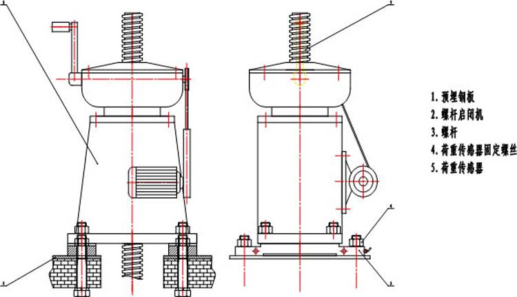 此设备是本所具有实用的产品。,安装与螺杆启闭机的基座下,每一边各装置一只超载保护装置,通过两边的固定螺丝分别于基座和底角相连接,每台螺杆启闭机安装两只超载保护装置(或一边使用相同尺寸的钢制件)。利用荷重传感器正反受力的原理来实现螺杆机过载保护。