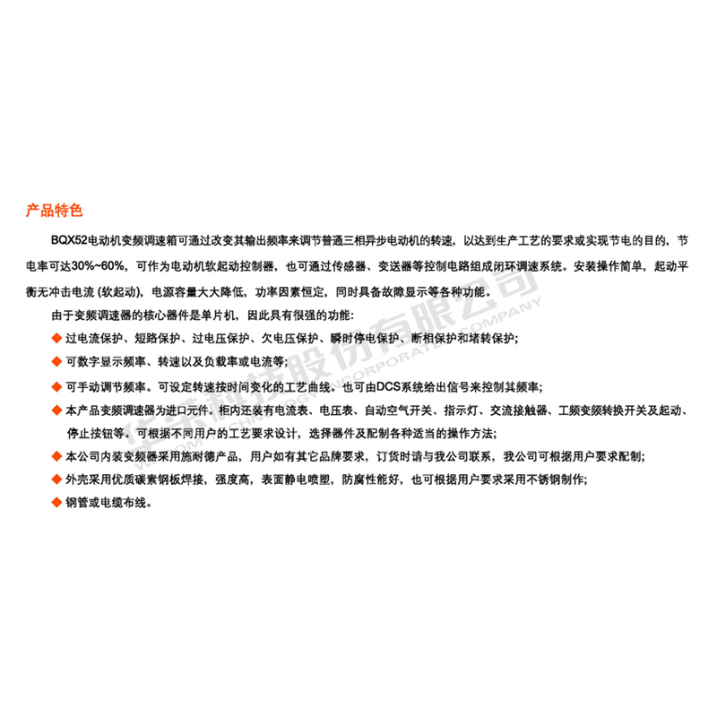 六、多种起动方式,可方便地选择电压斜坡起动、限流起动和转矩起动等方式,实现较好的起动效果。