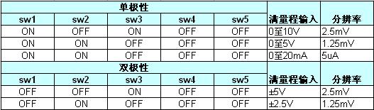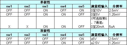 注:表中0~5V和0~20mA(4~20mA)的拨码开关设置是一样的,也就是说,当拨码开关设置为这种时,输入通道的信号量程,可以是0~5V,也可以是0~20mA。