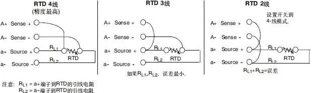因为热电阻分2线制、3线制、4线制,所以RTD模块与热电阻的接线有3种方式,如图所示。其中,精度高的是4线连接,精度低的是2线连接。