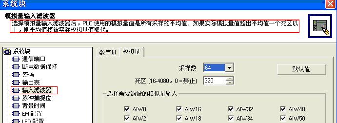 (1). 在STEP7 Micor/WIN软件中(S7-200的编程软件),对于模拟量输入通道设有软件滤波功能,如图所示,具体请参见《S7-200 ? LOGO? SITOP 参考》->系统块-模拟量滤波。