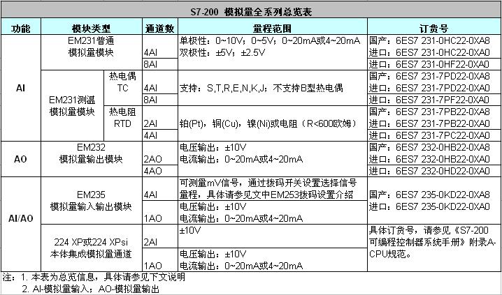 首先,请参见“S7-200模拟量全系列总览表”,初步了解S7-200模拟量系列的基本信息,具体内容请参见下文详细说明: