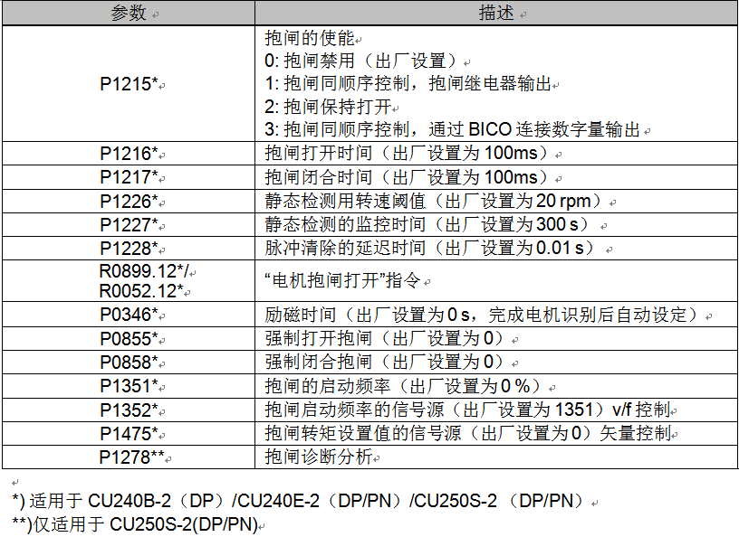 G120变频器具有一个内部逻辑专门用于控制电机抱闸,电机抱闸可以防止电机静止时意外旋转,特别是位能性负载。下表中列出抱闸控制参数: