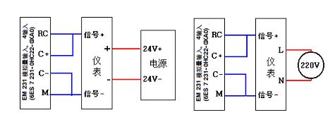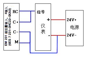 注:若设备的24VDC供电电源与EM231模块的供电电源不是同一个电源,那么,需要将模块的M端与该通道的负端引脚短接(如,M和C-短接)。这是为了使模块与测量通道工作在同一的参考电压,也就是等电位。下面的二线制接法同理。