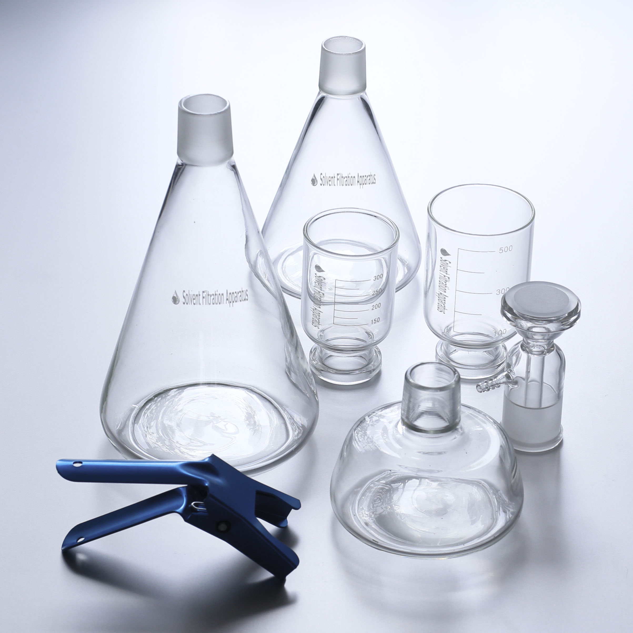 溶剂过滤器由过滤瓶装置和真空泵组成。过滤瓶包括三角形集液瓶 ( 2000 毫升和1000 毫升) 、砂芯过滤头、过滤杯 (250 毫升和 300 毫升) 和固定夹。
