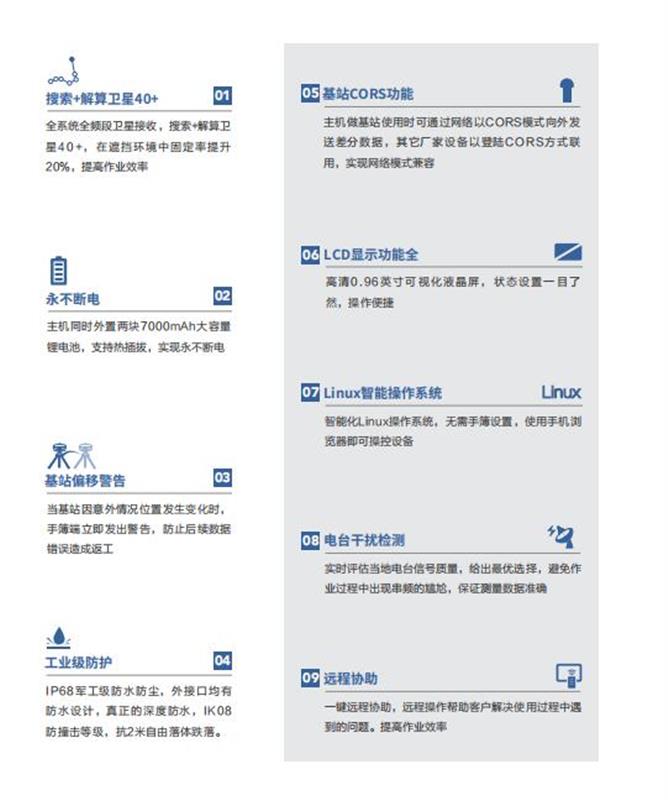 全系统全频段卫星接收,搜索+解算卫星40+,在遮挡环境中固定率提升20%,提高作业效率14000mAh大容量锂电池,基站内置电台5W发射可达12小时续航,解决用户内置电台模式的续航困扰内置eSIM,出厂即赠送三年测绘流量,野外插卡等繁琐操作,畅享极速网络服务主机做基站使用时可通过网络以CORS模式向外发送差分数据,其它厂家设备以登陆CORS方式联用,实现网络模式兼容华测国内数据链并发通讯技术,基站架设即启动,告别电台网络选择,智能AI优选工作模式,省心又省力