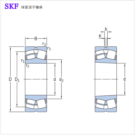 SKF球面滚子轴承有两列棍子,外圈有一个共用的球面滚道,内圈有两个滚道,与轴承的垂直轴线成某一角度。外圈球面滚道的球心位于轴承轴上。因此,这些轴承属于自调心轴承,可以承受较大的对中误差。例如,由轴的挠曲导致的轴与轴承座之间的不对中误差。球面滚子轴承设计精良,除了可承受很高的径向载荷之外,还可承受作用在两个方向的重轴向载荷。 SKF球面滚子轴承拥有市面上的产品种类和范围,包括标准轴承和特殊应用轴承。几乎所有SKF球面滚子轴承都配有圆柱孔和圆锥孔。圆锥孔的锥度为1:12(型号后缀为K)或1:30(型号后缀为K30),具体取决于轴承系列。 标准轴承的种类包括: • 基本设计轴承承 • 密封轴承 • SKF能效型(E2)轴承 SKF的基本种类,只是全部产品种类中的一部分。对于需要轴承承受运行条件的应用场合,SKF可专门定制轴承以满足特殊应用需求。 例如: • 专门用于印刷机、造纸机或涂胶机的高精度轴承 • 用于极度恶劣环境下的轴承,如连铸机 • 高温应用轴承 • 以间隙配合安装在辊颈上的轴承 • 铁路轴承 有球面滚子轴承特殊应用的更多信息,请联系我们。 | |||||