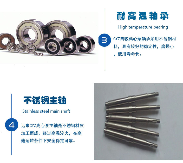 CYZ自吸泵采用轴同回液的泵体结构,泵体由吸入室、储液室、涡旋室、回液孔、气液分离室等组成。泵的轴承采用单列向心球轴承。在一些泵的轴承体底部设有冷却室。泵内部高、低压区间有密封环。轴端采用机械密封。