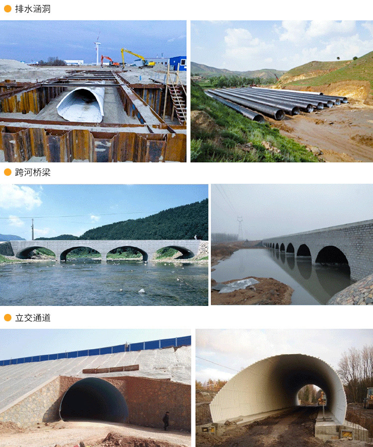 (4) 、涵管、波纹管涵、钢制波纹管涵洞、金属波纹涵管现场安装方便,不需使用大型设备。