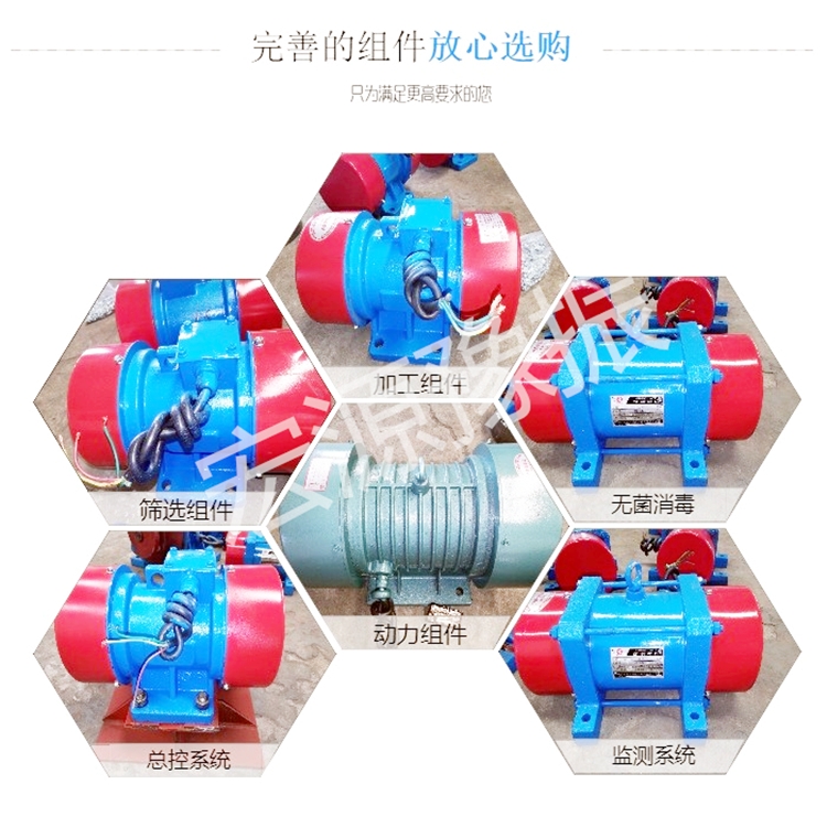 C.振动电机振动源三相异步电动机也叫三相异步振动电机,激振力可以无级调节;既将动力源与振动源合为一体的电动旋转式激振器.材质是机身采用球墨铸铁具有强度高、耐磨性能好、耐高低温、耐腐蚀。电压可选择380V或220V可定做