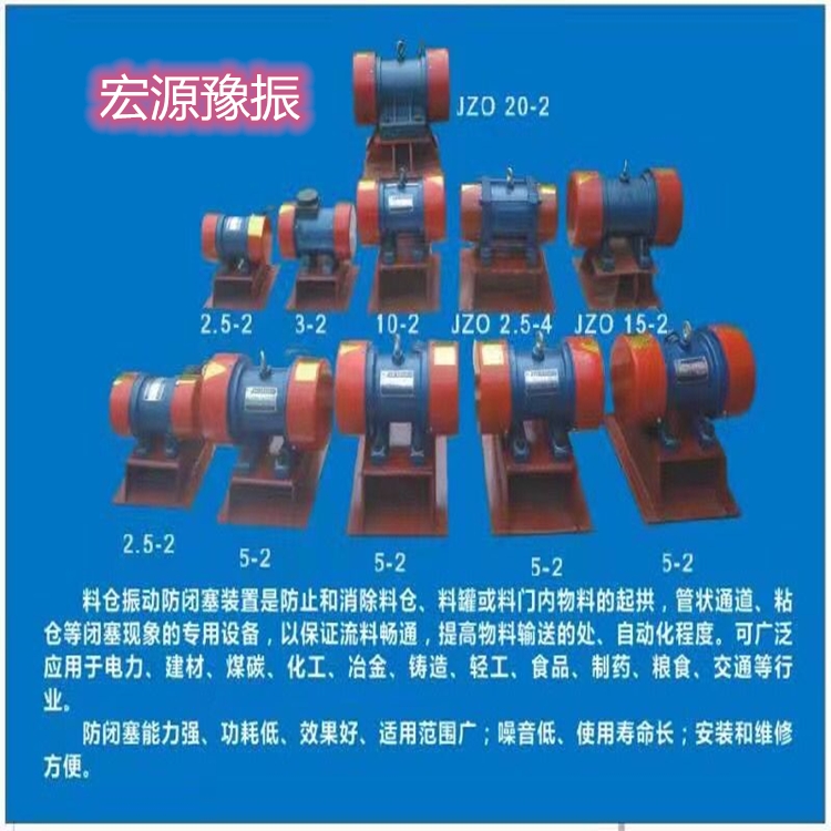 宏源豫振仓壁振动器的激振力可以无级调节,使用方便,JZO、YZU、YZO、 YZS、YZD、TZDC、YZCB 等型号的仓壁振动器振动电机为通用型振动电机。