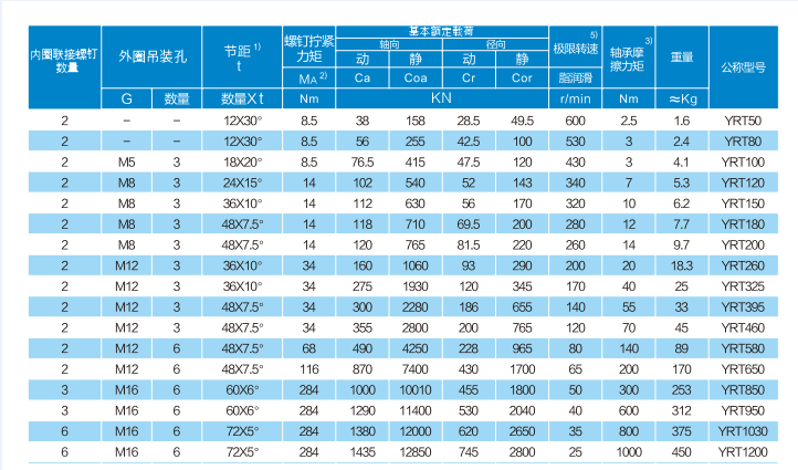 YRT转台轴承由一个推力/向心轴圈,一个推力垫圈,两个滚针保持架组件和一组向心圆柱滚子组成。座圈和轴圈有均布的安装用螺钉孔。该型轴承具有高轴向和径向承载能力。高倾斜刚度和高的精度。适用于回转工作台,卡盘和铣刀头以及测量和实验中的轴承配置。该型轴承对与之相配的设备零件的要求也较高。安装时需控制安装螺钉的扭紧力矩。