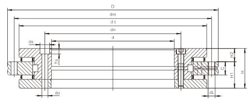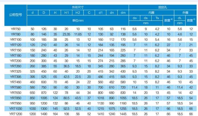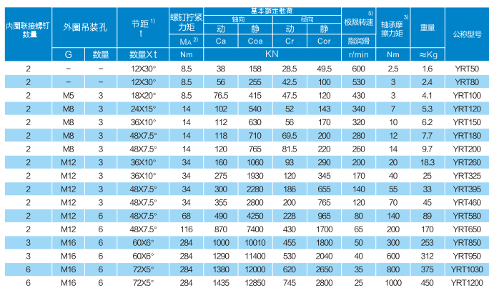推力-向心组合结构,可同时承受双向轴向载荷、径向载荷和倾覆力矩。轴承上均布有安装孔,可使用螺栓直接对轴承固定;出厂时轴承已加有预载荷,安装无需调整游隙;YRT转台轴承系列适用于转速较低、运转周期较短、对刚性和精度要求高的场合,如回转工作台、分度头。