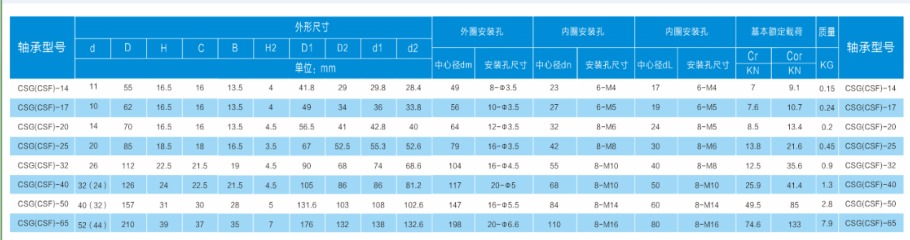 谐波减速器轴承包括刚性轴承和柔性轴承两大类型,刚性轴承包含四种系列,CSG系列、SHG系列,其命名方式采用减速器的命名;柔性轴承的命名为HYR。 产品名称:CSG系列 介绍:外圈被分成两片,内圈为整体结构,安装时不需要法兰和轴承座,主要应用在CSG和CSF系列的各类减速器输出部位。
