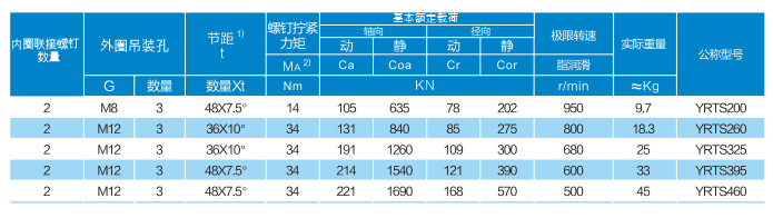 性能特点 (除基本功能外的其它特质,例如工作时长、操作简便性等) YRTS 高速转台轴承(简称 YRTS 转台轴承)系列外形结构尺寸与 YRT 系列相同,但内部结构异于 YRT 系列,这就决定了 YRTS 转台轴承系列极限转速较 YRT 转台轴承系列高一些,摩擦力矩较 YRT 转台轴承系列低并且均匀,因此,对于需要相对较低摩擦但相对高速的场合,可选用该系列,例如由直驱电机所驱动的轴使用的轴承。 技术参数 (例如材质、工艺、尺寸的技术标准等)