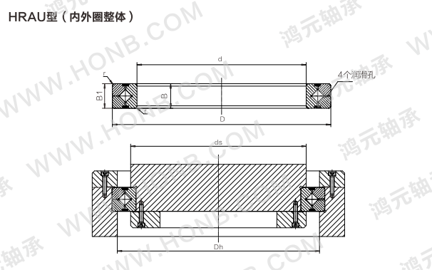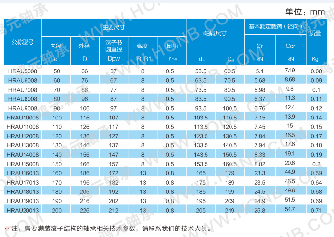性能特点 (除基本功能外的其它特质,例如工作时长、操作简便性等) H RAU 系列交叉圆柱滚子轴承,此型号是将 HRB 型内外圈厚度减小到极限的紧凑, 适合于需要重量轻、紧凑设计的部位,例如机械手旋转部位,并且能够适用于内圈和外圈旋转的场合。 技术参数 (例如材质、工艺、尺寸的技术标准等)