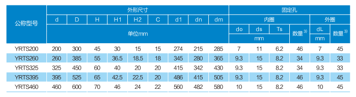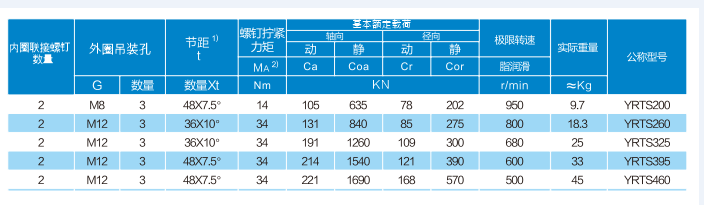 性能特点 (除基本功能外的其它特质,例如工作时长、操作简便性等) 介绍:YRTS高速转台轴承(简称YRTS转台轴承)系列外形结构尺寸与YRT系列相同,但内部结构异于YRT系列,这就决定了YRTS转台轴承系列极限转速较YRT转台轴承系列 一些,摩擦力矩较YRT转台轴承系列低并且均匀,因此,对于需要相对较低摩擦但相对高速的场合,可选用该系列,例如由直驱电机所驱动的轴使用的轴承。 技术参数 (例如材质、工艺、尺寸的技术标准等)