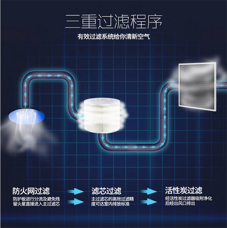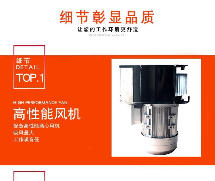 3. 配备高性能的离心风机,吸风量大,工作噪声低。