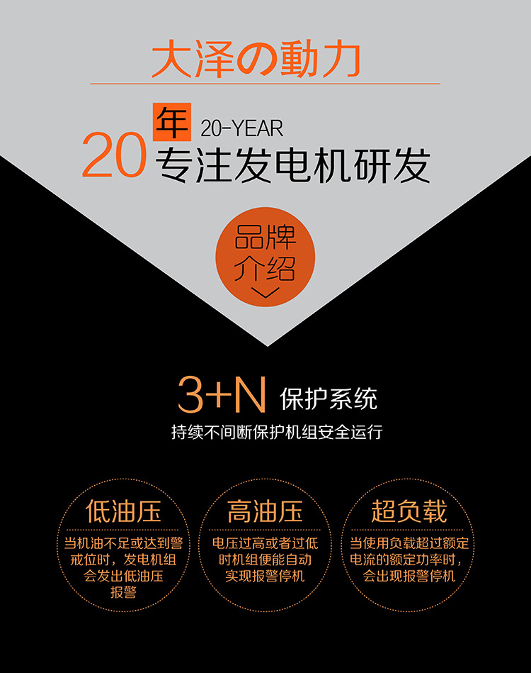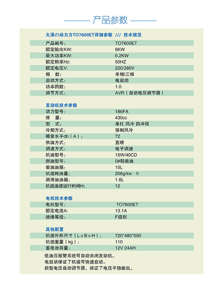 [产品配置]:配置有LED显示屏面板和内部配置。LED显示屏显示燃油位置、电压、功率输出、频率、风冷电机、累计运行时间,内部配置有过载保护、缺油 告、机油 告、电压不稳定 告、低油压、如出现问题在LED面板的蜂鸣 报器鸣叫闪烁,如果人不在本机自带自我保护功能会自动停止运转工作。