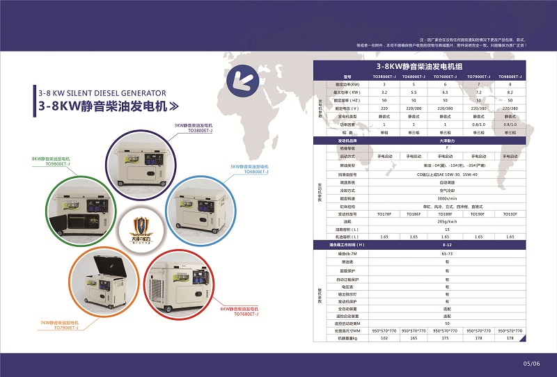 大泽动力5kw静音柴油发电机TO6800ET-J技术参数 型号:TO6800ET-J