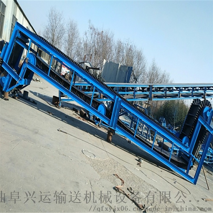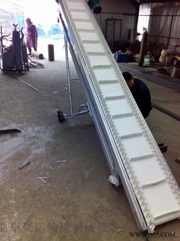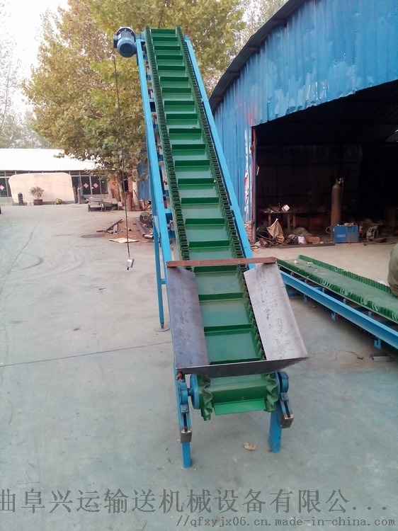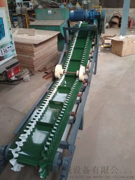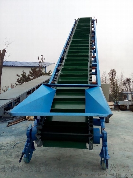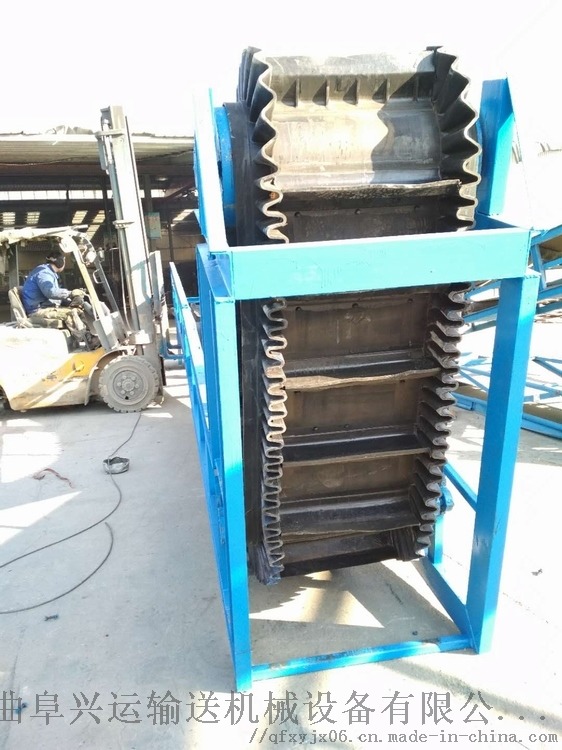 波状挡边输送带可沿水平、倾斜、垂直和变角方向输送各种散装物料,从煤、矿石、沙子到化肥和粮食等。爬坡挡边输送机该机可在倾角0b~90b范围内任意布置,强度可达到原带90%以上强度,裙边与隔板采用二次硫化粘接在基带上面油类物质或有机溶剂等成份的物料需采用特殊的输送带及相应的防护措施,上托辊类似普通带式输送机的平形上托辊,用于支撑输送带承载分支,其中凸弧段托辊用于凸弧段支撑输送带没有波状挡边的一面改变运行方向,缓冲托辊用于受料处,波状档边格挡,其中导向轮用弹性橡胶制成,仅用于垂直输送段,其中对留有空边的波状挡边输送带