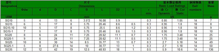UBMSG系列提供的导轨滚轮型号如下:SG10(SGB4)、SG15(SGB6)、SG15-10、SG15-1、SG20(SGB8)、SG20-1、SG25(SGB10)、SG25-1、SG35(SGB15) 型号尺寸基本额定负荷钢球数重量