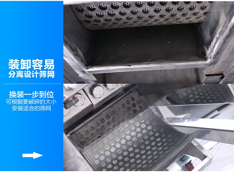 机器采取不锈钢材质,外表豪华美观大方,符合 GMP 要求。(可以根据客户要求定制 304 不锈钢材质) 进料斗、破碎室、筛网是分离设计,装卸容易。