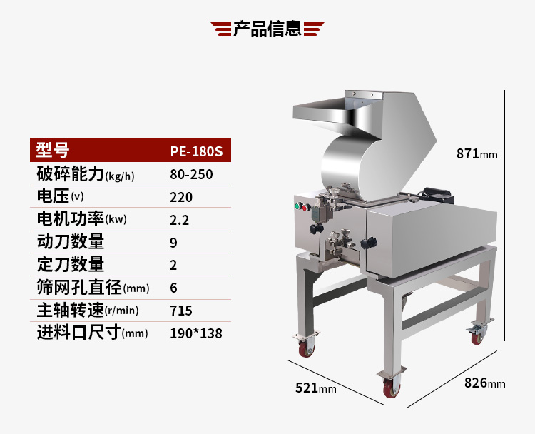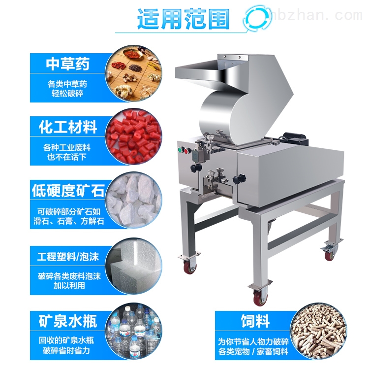 4. 本系列破碎机的 180/250/400 型号都装有橡胶脚轮,方便移动,脚轮带有刹车。 二 金本不锈钢破碎机适用于中草药、化工材料、硬度较低的矿石以及聚苯乙烯、聚丙烯、尼龙、工程塑料和聚氯泡沫软料的废、次品或注射喷头等破碎之用。