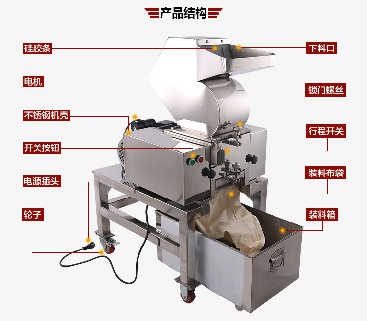 金本不锈钢破碎机的机架高度和宽度比传统铁质破碎机要大 15-30 厘米,这样使接料斗的长宽高都有相当大的提升,接料斗容积比普通破碎机的接料斗大一倍以上。