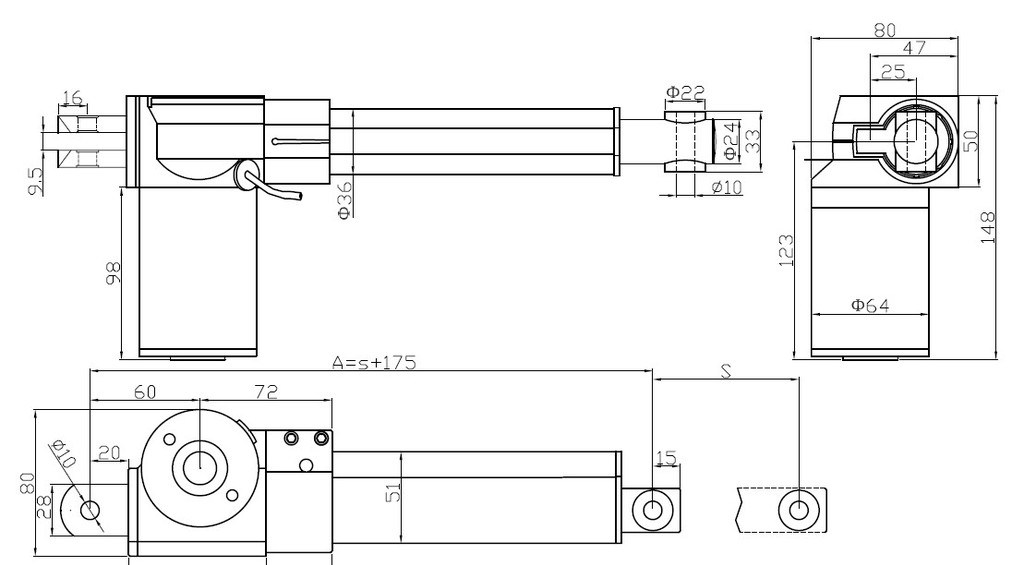 4. 短安装距(内管完全收回来前后两孔中心距离):L=S(行程)+175mm;内管完全伸出去前后两孔中心距离=2*S(行程)+175mm