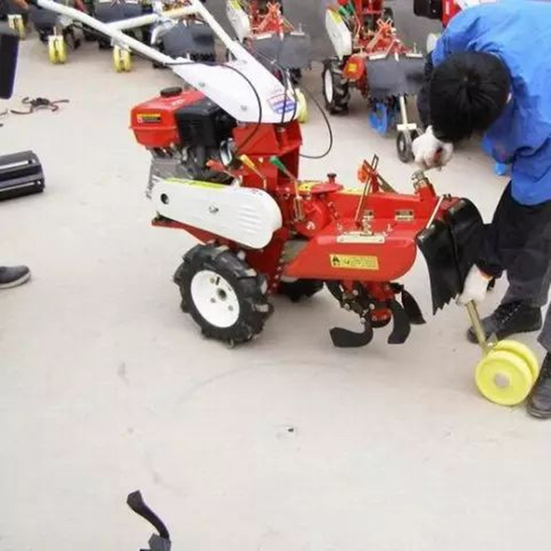 8、型号齐全,可选装电启动,集成开关原理 采用低速发动机作为动力,经皮带传动至变速箱,通过变速箱内的齿轮变速,然后直接传到耕作的部件,更换不同的作业部件可以进行多种农田作业。采用张紧式离合装置,前进、后退各两个档位。体积小、重量轻、作业稳定性好,手把可左右高地任意调整。使用范围 本机器仅用于常规的农业作业。主要进行大棚地、菜地、果园、山坡等小地块作业。特点:1、体积小,适合在狭窄或倾斜地作业。2、作业稳定性好,转弯掉头轻快、敏捷。3、耕耘部覆盖可作伸缩调整,并可开成各种角度之V形状。4、设有旋调式单导轮,深浅调整容易。5、把手可以上下、左右调整,适合种作业方式。6、配合转向离合器,通过操作手柄可琴艺实现转向。7、本机可做中耕除草、松土、培土、挖沟、起垄、苗床、苗沟、种子覆土等作业。