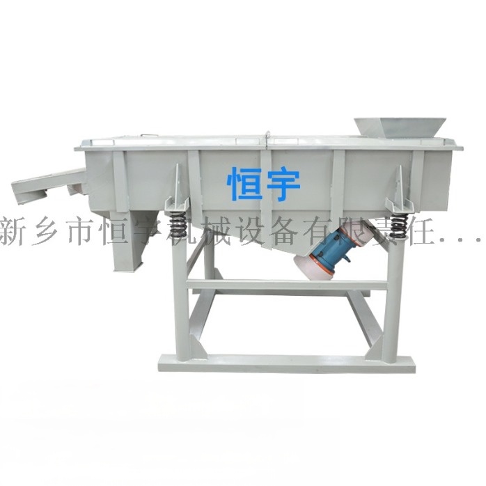 二、工作原理 直线筛工作时,两电机同步反向旋转使激振器产生反向激振力,迫使筛箱带动筛网做 纵向运动,使其上的物料受激振力而周期性向前抛出一个射程,从而完成物料筛分作业。 两台振动电机做同步、反向旋转时,其偏心块所产生的激振力在平行于电机轴线的方向相 互抵消,在垂直于电机轴的方向叠为一合力,因此筛机的运动轨迹为一直线。两电机轴相 对筛面在垂直方向有一倾角,在激振力和物料自重力的合力作用下,物料在筛面上被抛起 跳跃或向前作直线运动,从而达到对物料进行筛选和分级的目的。 三、适用行业 该产品广泛应用于化工、食品、塑料、医药、冶金、玻璃、建材、粮食、化肥、磨料、 陶瓷等行业中干式粉状或颗粒状物料的筛分。物料粒度在 0.074—5mm,含水量小于 7%, 无粘性的各种干式粉状或颗粒状物料的筛分。 给料粒度不大于 10mm。