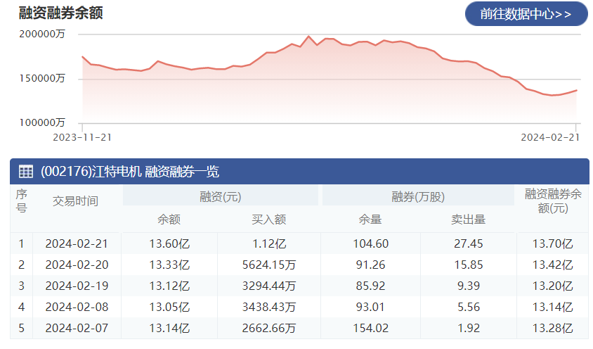 同花顺(300033)数据中心显示,江特电机(002176)2月21日获融资买入1.12亿元,占当日买入金额的24.47%,当前融资余额13.60亿元,占流通市值的8.23%,低于历史50%分位水平。