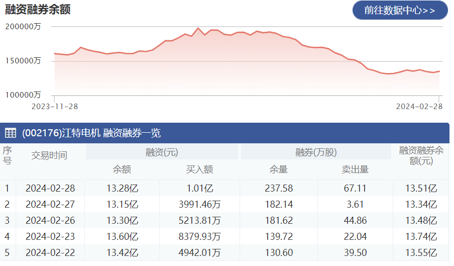 同花顺(300033)数据中心显示,江特电机(002176)2月28日获融资买入1.01亿元,占当日买入金额的18%,当前融资余额13.28亿元,占流通市值的7.93%,低于历史50%分位水平。