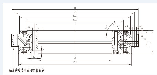 ZKLDF系列推力角接触球轴承包括一个整体外圈、两个内圈和两组钢球及保持架组件,接触角为60度。外圈和内圈带有安装孔,方便通过连接螺栓对轴承进行安装固定。轴承自身通过联接螺栓固定,保证安装运输和搬运。 ZKLDF推力角接触球系列转台轴承的两侧有密封盖,可防止外部污物、杂质的进入和内部润滑脂的泄漏。 ZKLDF推力角接触球系列转台轴承使用复合钡基脂润滑,亦可通过外圈上的油孔再润滑。 ZKLDF推力角接触球系列转台轴承采用双向60度接触角、双排球结构设计故可承受径向载荷、双向轴向负荷和倾覆力矩;特殊结构的黄铜保持架设计,使其具有 的强度、较低的摩托力矩;因此该系列轴承特别适合于 速、长期运转和对刚性、精度有高要求的场合。
