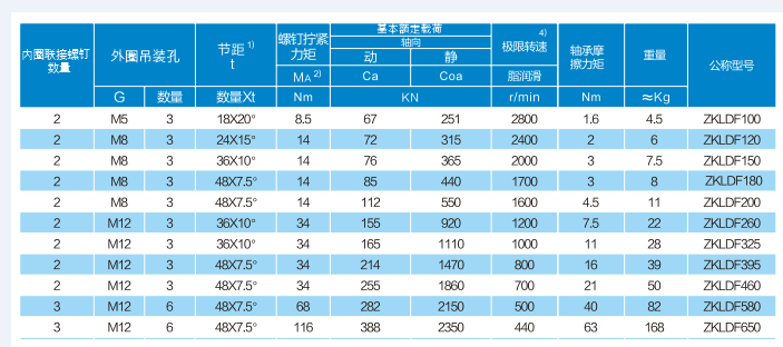 ZKLDF推力角接触球系列转台轴承使用复合钡基脂润滑,亦可通过外圈上的油孔再润滑。