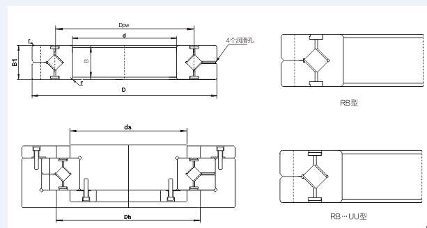性能特点 (除基本功能外的其它特质,例如工作时长、操作简便性等) RB型此型号为交叉滚子轴承的基本型。外圈被分为两篇,内圈为整体结构,它适合用于要求内圈旋转精度的场合。 技术参数 (例如材质、工艺、尺寸的技术标准等)